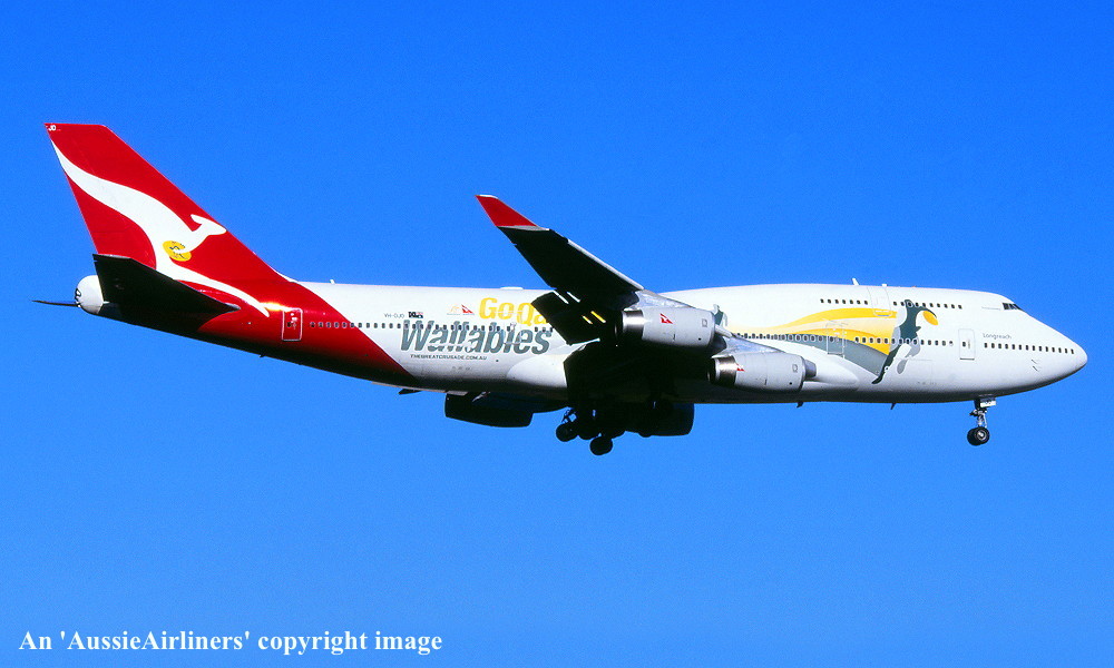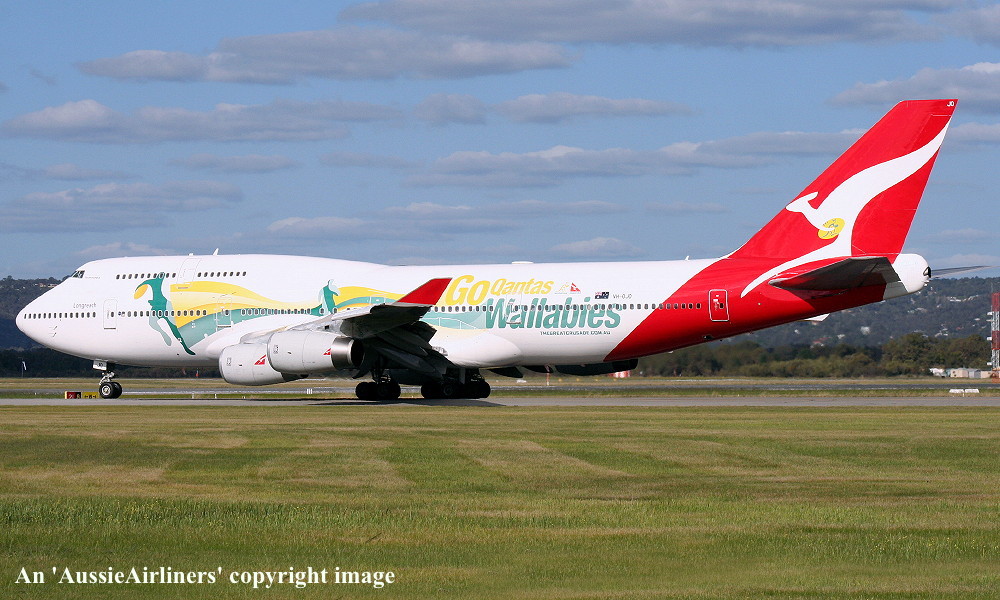 VH-OJO. Qantas Spirit of Australia - 'Toowoomba' in the 'New Roo' livery with additional 'Go Qantas Wallabies' decals at an unknown airport, July 2011. (R. N. Smith Collection Copyright Image 4630-869.) |