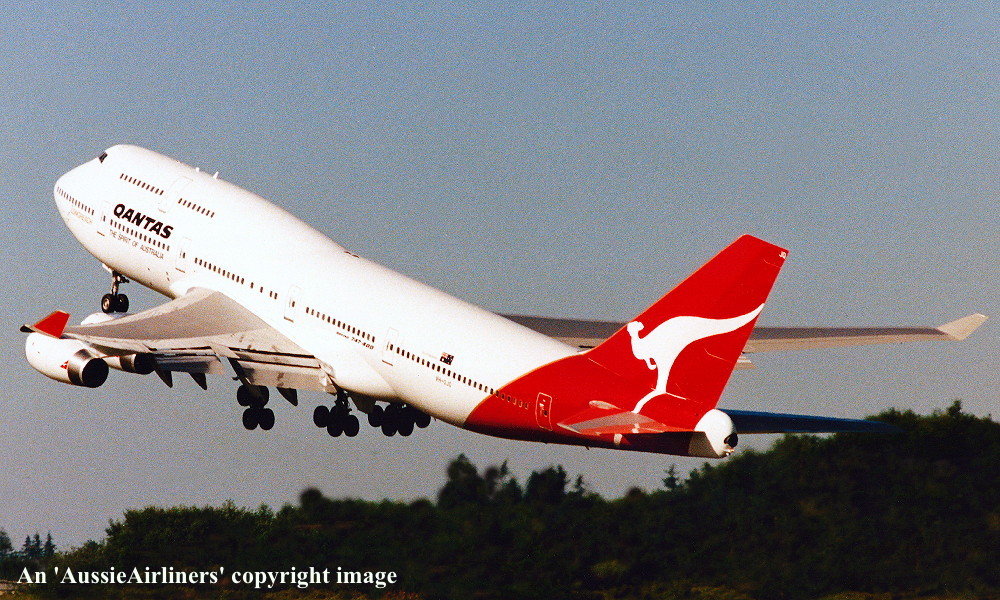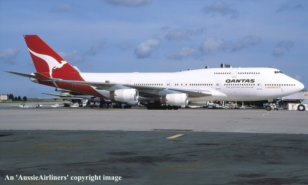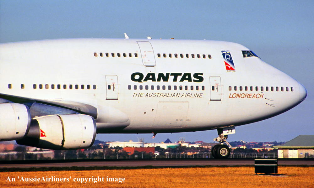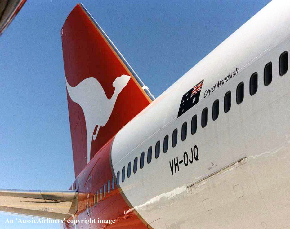 VH-OJQ. Qantas The Australian Airline - 'City of Mandurah' in the standard livery with additional '75 Years Birthday' decal at Sydney Kingsford Smith Airport, February 1996. (N. Louis Copyright Image 4631-780.) |