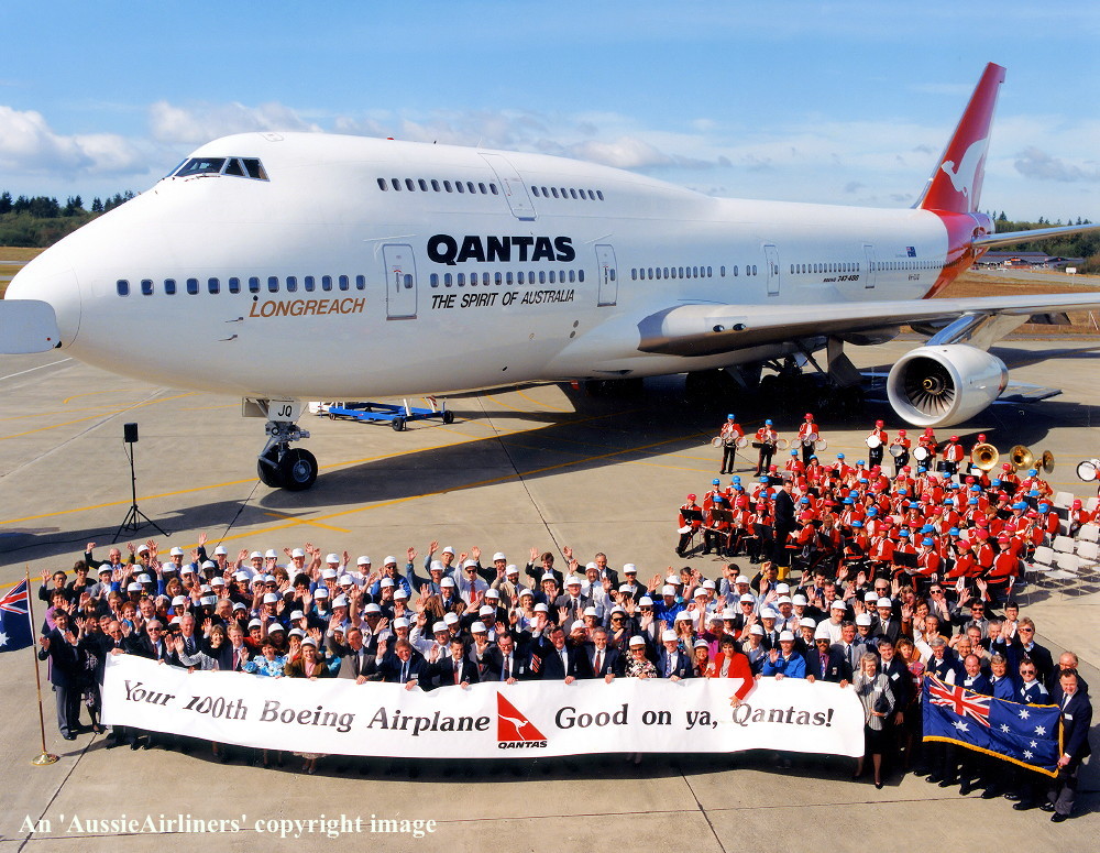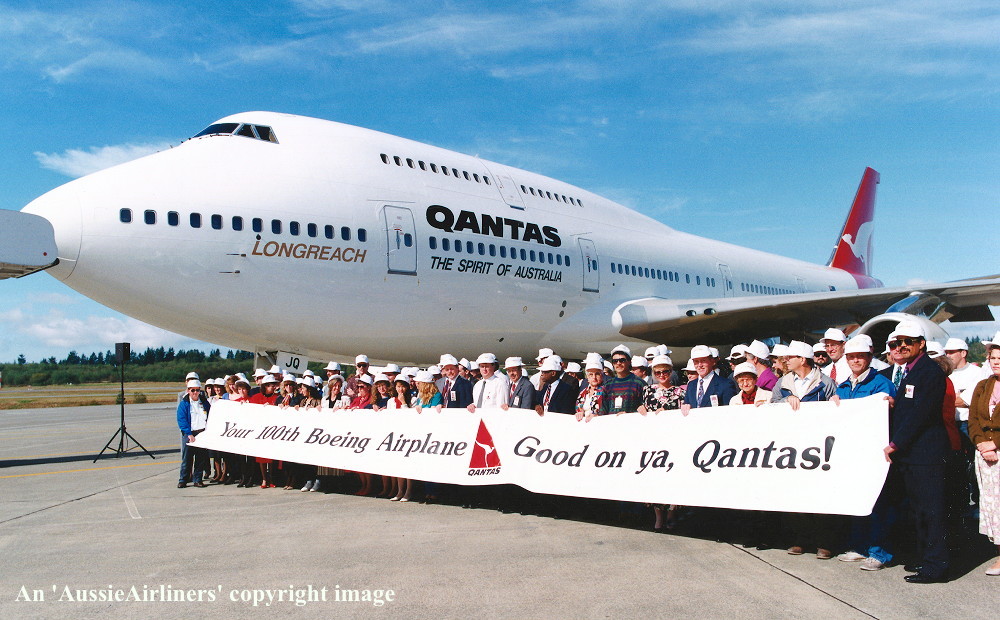 VH-OJQ. Qantas The Spirit of Australia - in the all-metal livery with additional '100th Boeing Airplane For Qantas' banner at Everett Paine Field, May 27, 1992. (S. Collins Collection Copyright Image 4631-274.) |