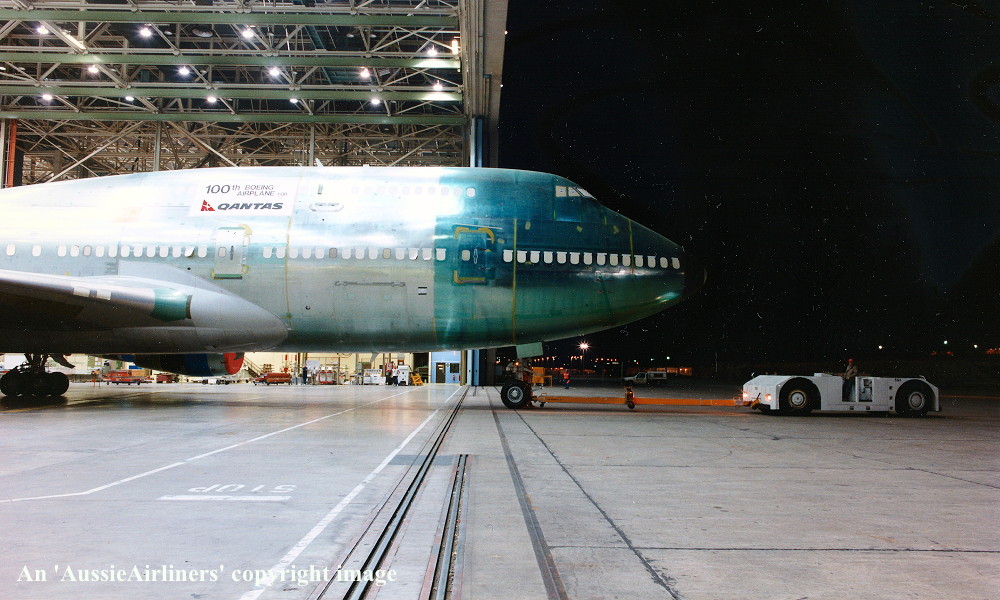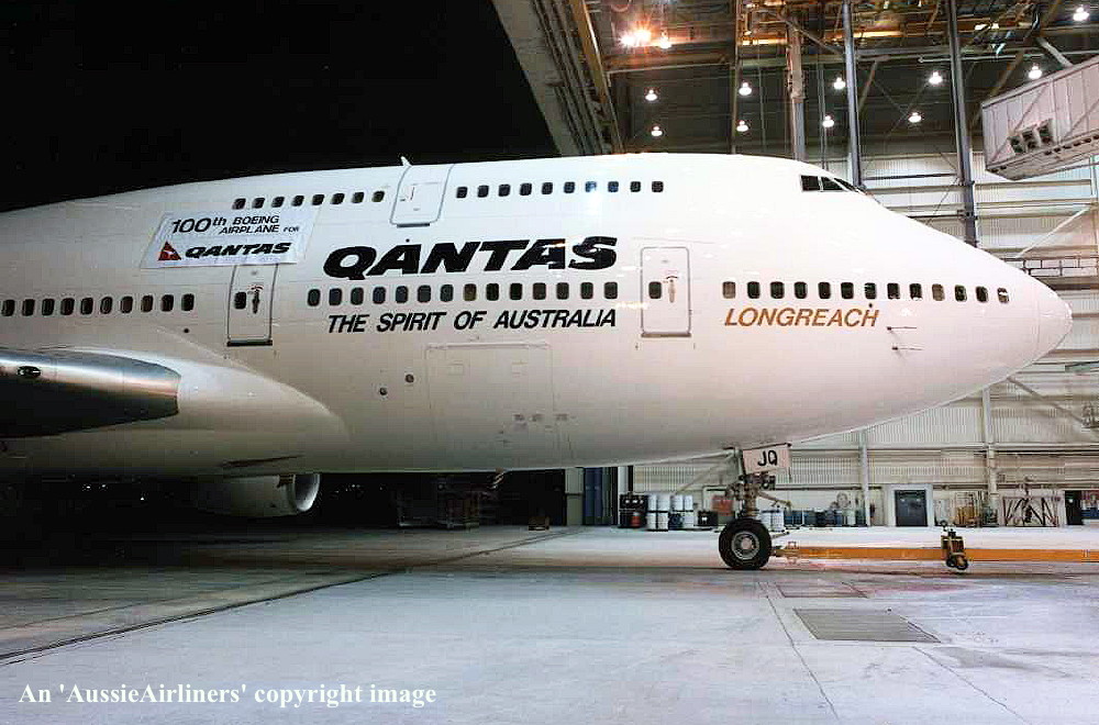 VH-OJQ. Qantas The Spirit of Australia - in the all-metal livery with additional '100th Boeing Airplane For Qantas' banner at Everett Paine Field, May 27, 1992. (S. Collins Collection Copyright Image 4631-275.) |