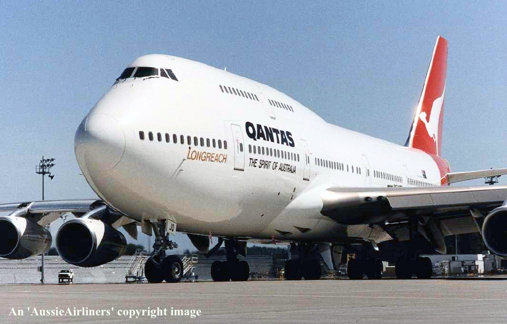 VH-OJQ. Qantas The Spirit of Australia - 'City of Mandurah' in the standard livery at Everett Paine Field, August 31, 1992. (S. Collins Collection Copyright Image 4631-287.) |