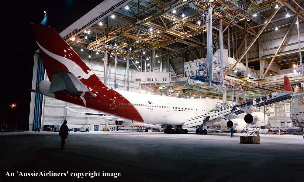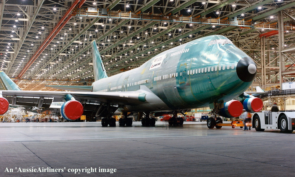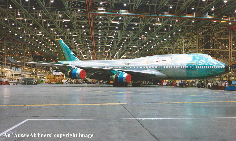 VH-OJQ. Qantas The Spirit of Australia - 'City of Mandurah' in the standard livery at the Everett Paine Field Paint Shop, June 1992. (S. Collins Collection Copyright Image 4631-278.) |