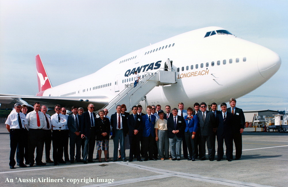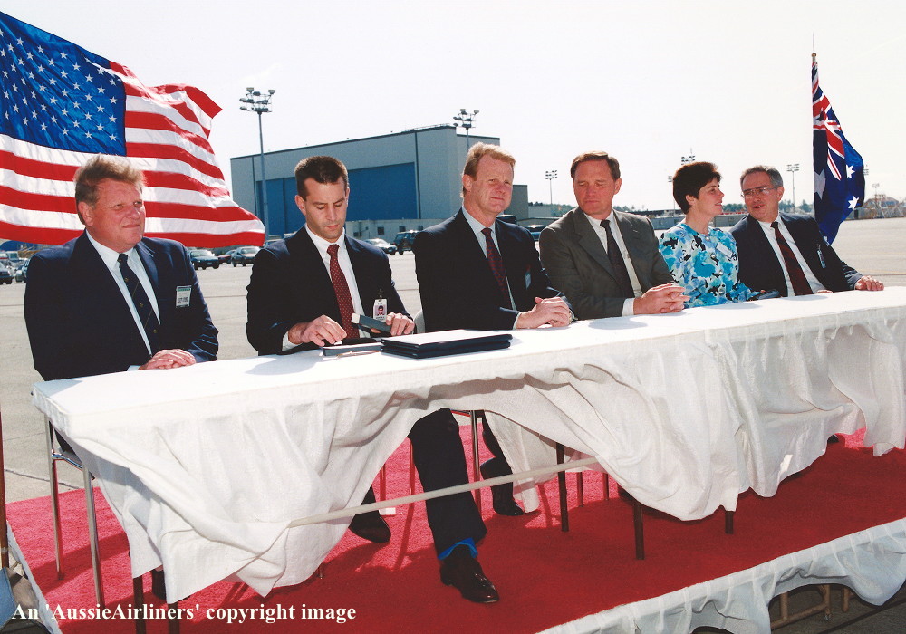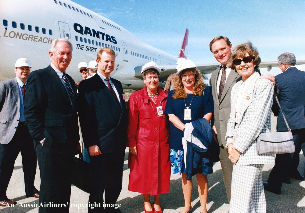 VH-OJQ. Qantas The Spirit of Australia - 'City of Mandurah' the official delivery ceremony at Everett Paine Field, September 18, 1992. From L to R: Capt Ken Davenport (Qantas Director of Flight Operations), Marty Bentrott (Boeing Contracts Director), John Ward (Qantas Chief Executive), Jim Johnson (VP & GM Boeing Everett Division), Edna Ward (wife of John Ward), ?? (Boeing VP Sales). (S. Collins Collection Copyright Image 4631-279.) |