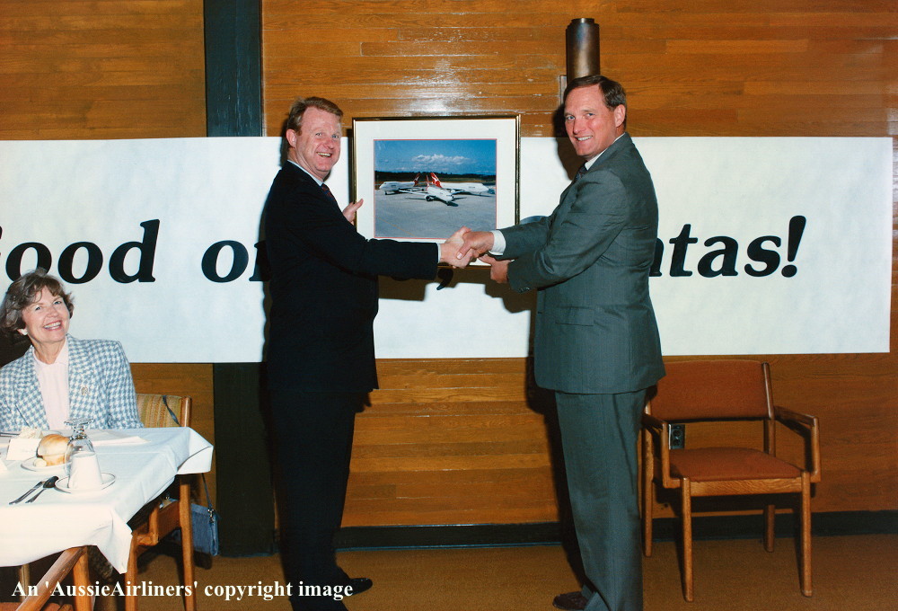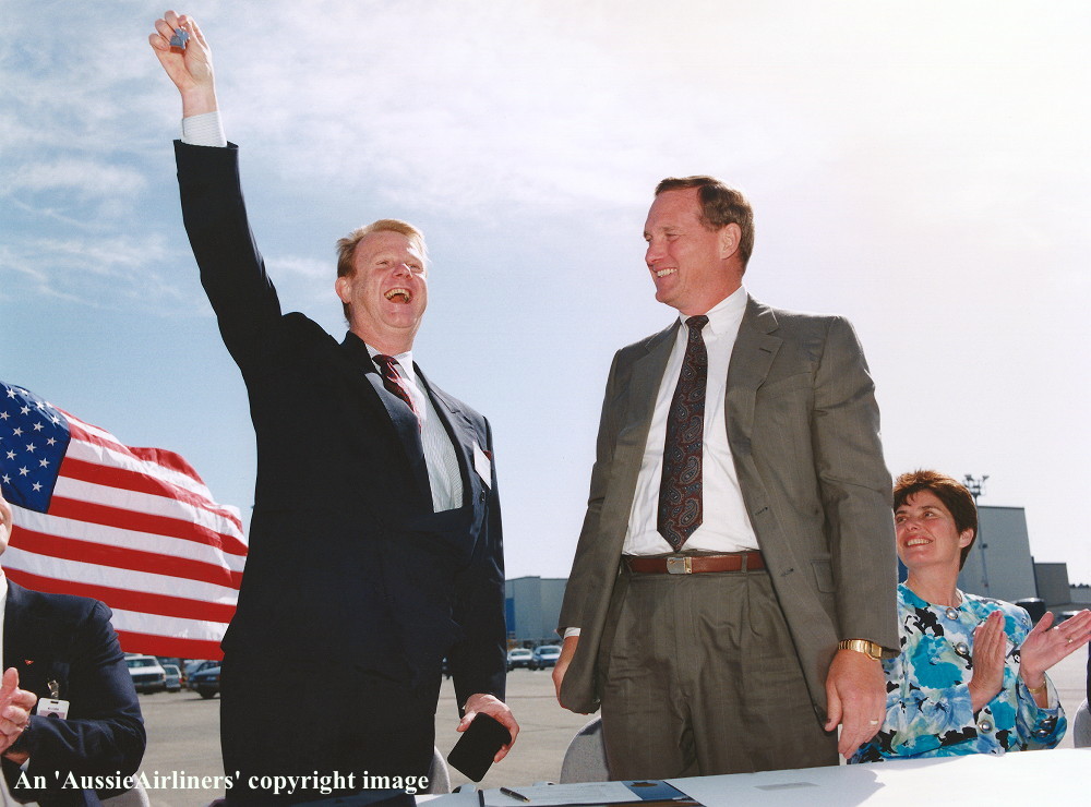 VH-OJQ. Qantas The Spirit of Australia - 'City of Mandurah' the official delivery ceremony at Everett Paine Field, September 18, 1992. From L to R: John Ward (Qantas Chief Executive), Jim Johnson (VP & GM Boeing Everett Division). (S. Collins Collection Copyright Image 4631-280.) |
