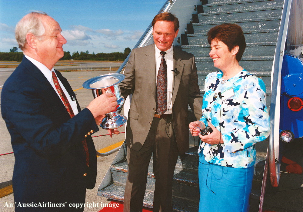 VH-OJQ. Qantas The Spirit of Australia - 'City of Mandurah' the official delivery ceremony at Everett Paine Field, September 18, 1992. From L to R: Connie Brog, John Ward (Qantas Chief Executive), Jim Johnson (VP & GM Boeing Everett Division). (S. Collins Collection Copyright Image 4631-286.) |