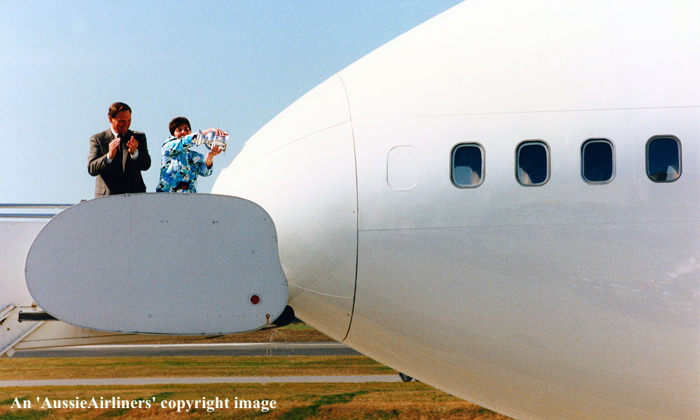 VH-OJQ. Qantas The Spirit of Australia - 'City of Mandurah' the official delivery ceremony at Everett Paine Field, September 18, 1992. From L to R: Jim Johnson (VP & GM Boeing Everett Division), Edna Ward (wife of John Ward). (S. Collins Collection Copyright Image 4631-282.) |