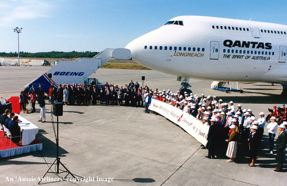 VH-OJQ. Qantas The Spirit of Australia - 'City of Mandurah' the official delivery ceremony at Everett Paine Field, September 18, 1992. (S. Collins Collection Copyright Image 4631-284.) |