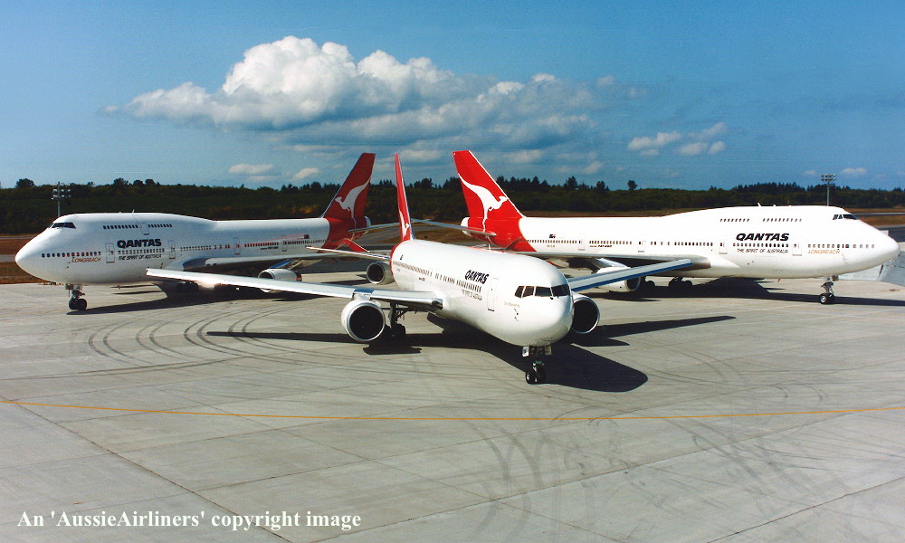 VH-OJQ. Qantas The Spirit of Australia - 'City of Mandurah' in the standard livery at Everett Paine Field, September 18, 1992. (Qantas Heritage Collection Copyright Image 4630-397.) |