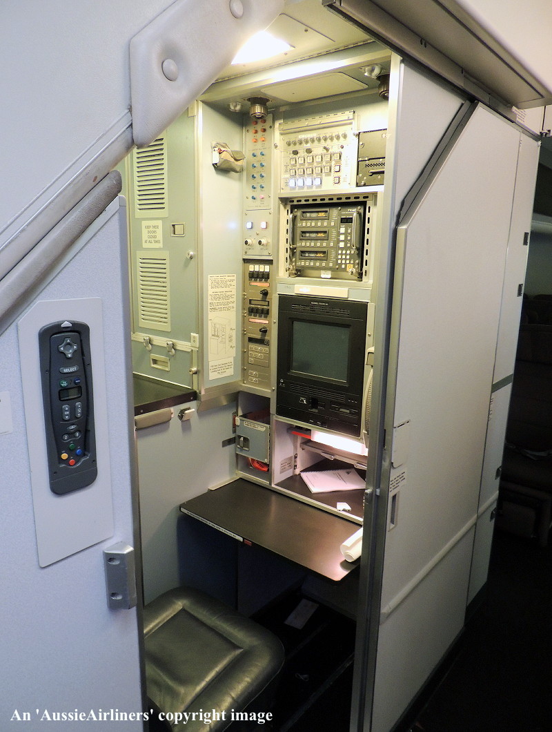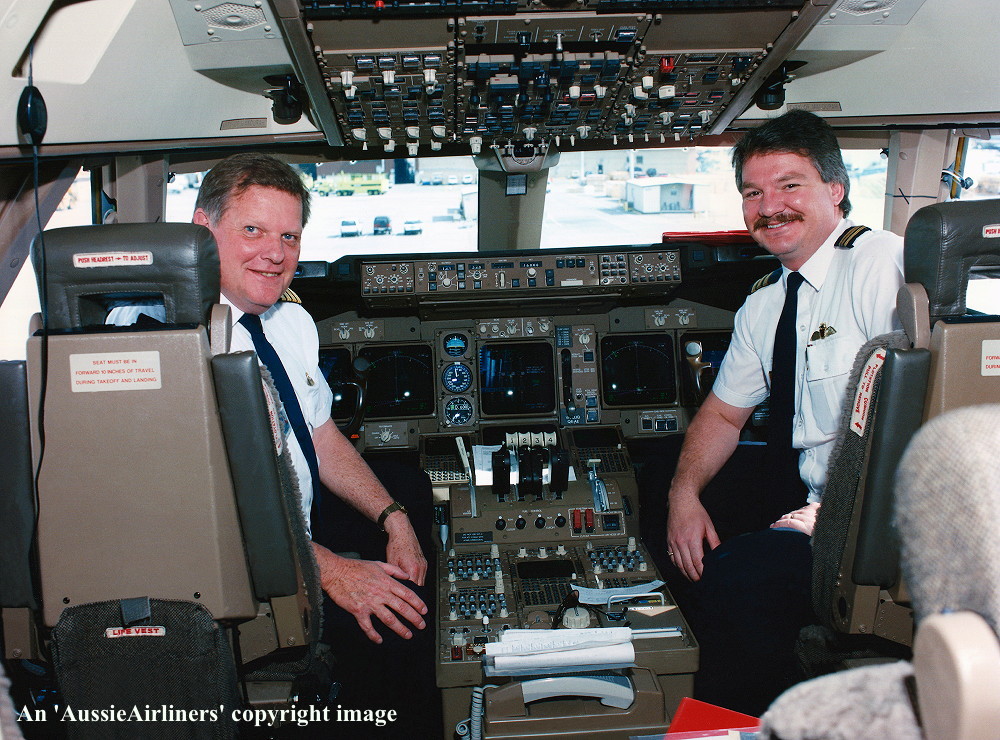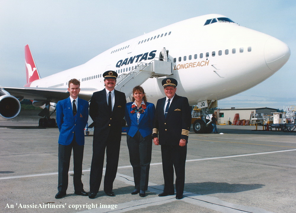 VH-OJQ. Qantas The Spirit of Australia - 'City of Mandurah' in the standard livery at Everett Paine Field, September 18, 1992. From L to R: Alan Craig (F/A), Phil Davenport (F/O), Soraya Turk (SFA), Ken Davenport (Chief Pilot, Director of Flight Operations). (S. Collins Collection Copyright Image 4631-290.) |