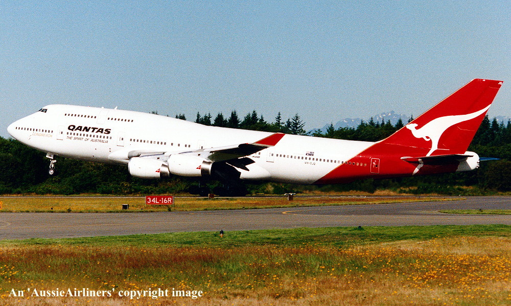 VH-OJQ. Qantas The Spirit of Australia - 'City of Mandurah' in the standard livery at Everett Paine Field, August 31, 1992. (S. Collins Collection Copyright Image 4631-288.) |