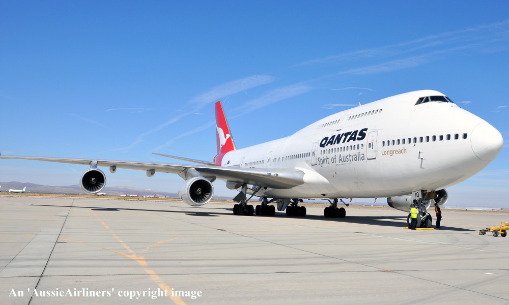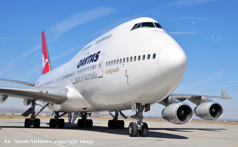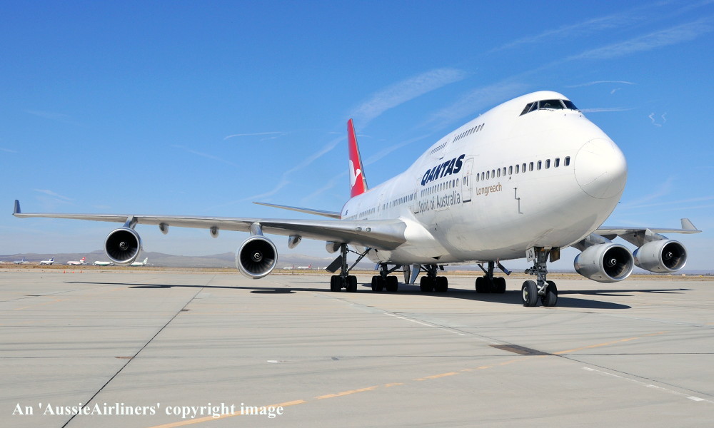 VH-OJQ. Qantas - in the basic livery at Victorville, April 27, 2013. (S. Collins Copyright Image 4631-323.) |