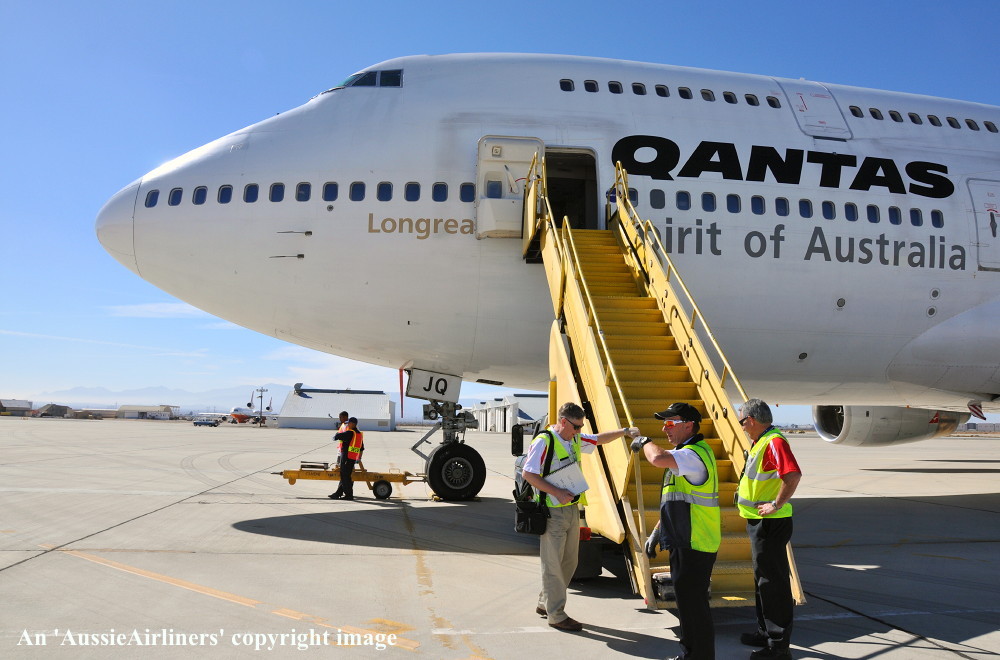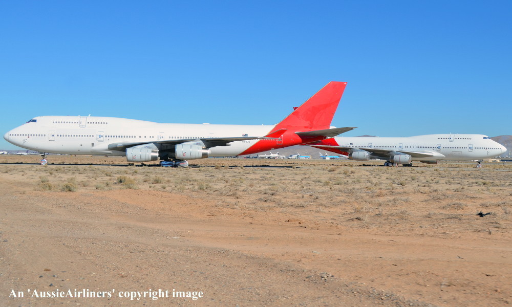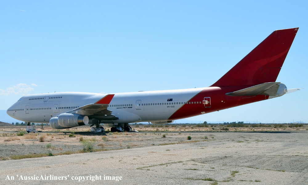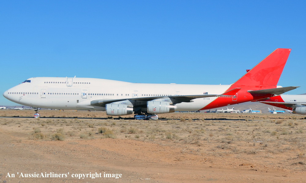 VH-OJQ. Qantas - in the basic livery at Victorville, December 12, 2013. VH-OJO is in the background. (S. Collins Copyright Image 4631-322.) |