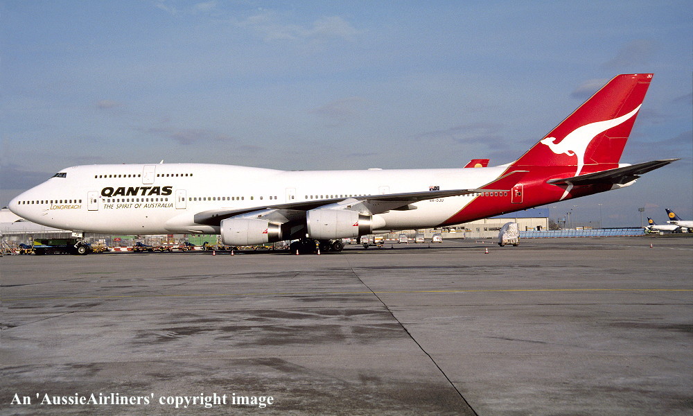 VH-OJU. Qantas The Spirit Of Australia - 'Lord Howe Island' in the original livery at Frankfurt Airport, October 2000. (R. N. Smith Collection Copyright Image 4630-977.) |