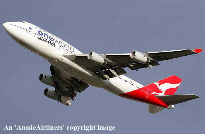 VH-OJU. Qantas Spirit of Australia - 'Lord Howe Island' in the 'New Roo' livery with additional 'One World' titles at Melbourne Tullamarine Airport, July 2010. (G. Canciani Copyright Image 4630-872.) |