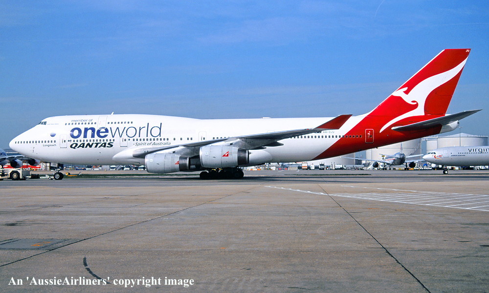 VH-OJU. Qantas Spirit of Australia - 'Lord Howe Island' in the 'New Roo' livery with additional 'One World' titles at London Heathrow Airport, September 2010. (R. N. Smith Collection Copyright Image 4630-583.) |