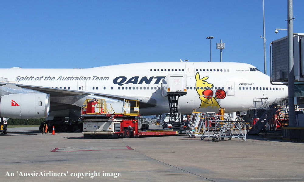 VH-OJU. Qantas Spirit of the Australian Team - 'Lord Howe Island' in the 'New Roo' livery with additional 'Olympic 2012' decals at Brisbane Airport, July 23, 2012. (R. N. Smith Collection Copyright Image 4630-982.) |