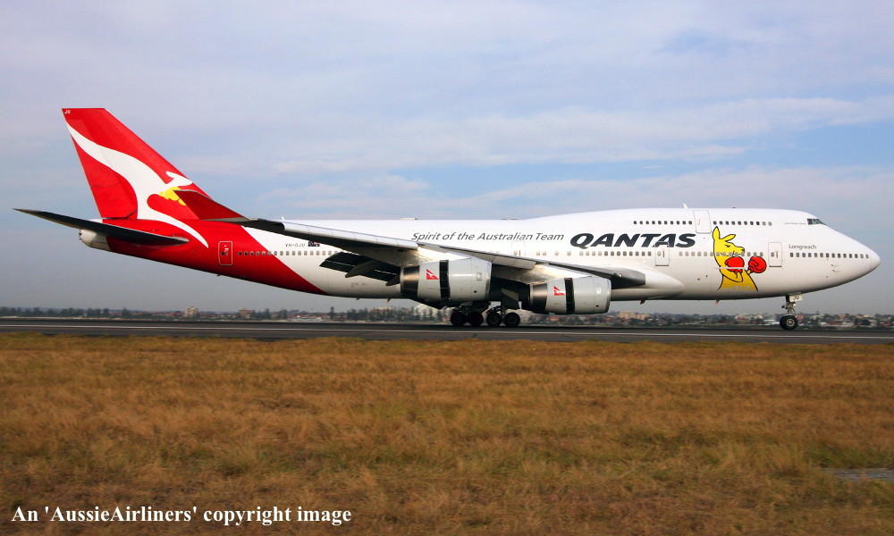 VH-OJU. Qantas Spirit of the Australian Team - 'Lord Howe Island' in the 'New Roo' livery with additional 'Olympic 2012' decals at Sydney Kingsford Smith Airport, September 27, 2012. (R. Finlayson Copyright Image 4631-013.) |
