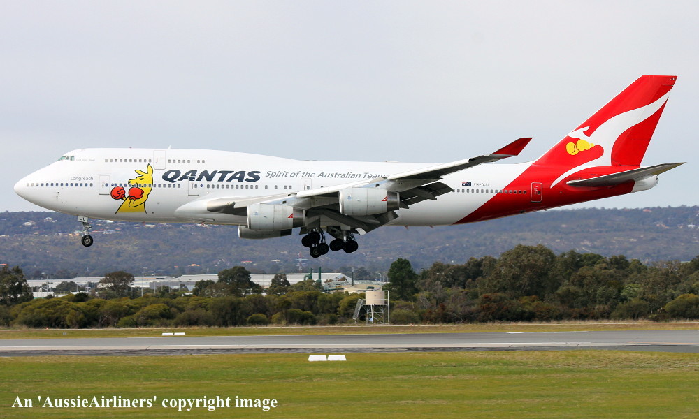 VH-OJU. Qantas Spirit of the Australian Team - 'Lord Howe Island' in the 'New Roo' livery with additional 'Olympic 2012' decals at Perth Airport, August 17, 2012. (M. Lynam Copyright Image 4631-022.) |