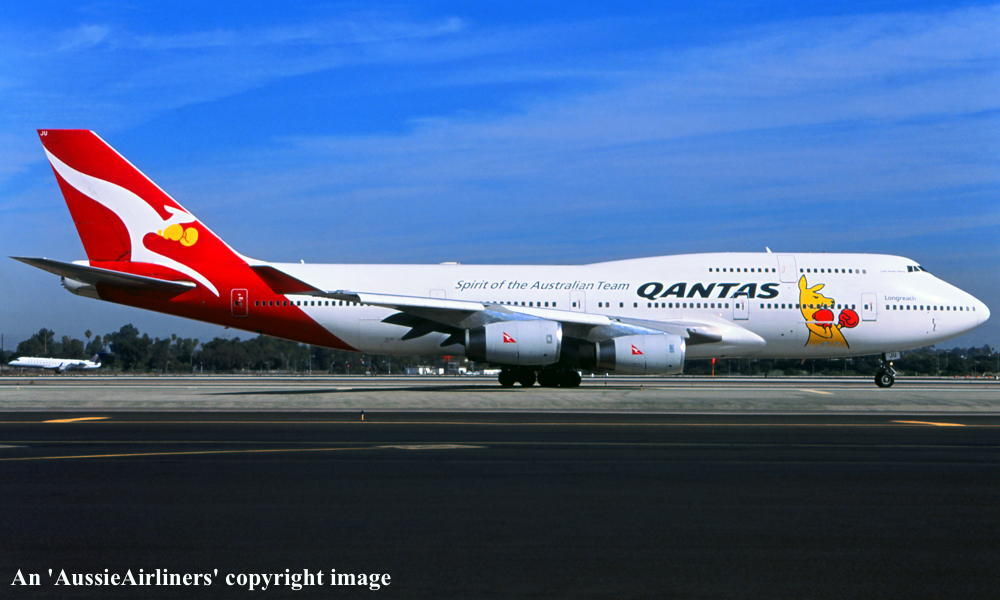 VH-OJU. Qantas Spirit of the Australian Team - 'Lord Howe Island' in the 'New Roo' livery with additional 'Olympic 2012' decals at Los Angeles Airport, October 2012. (R. N. Smith Collection Copyright Image 4631-147.) |