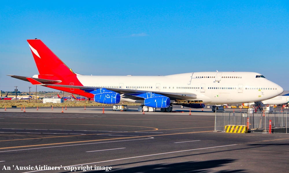 N747RR. Rolls Royce - in the basic Qantas livery at Moses Lake Airport, August 14, 2020. (H. Dejanikus Copyright Image 4631-730.) |