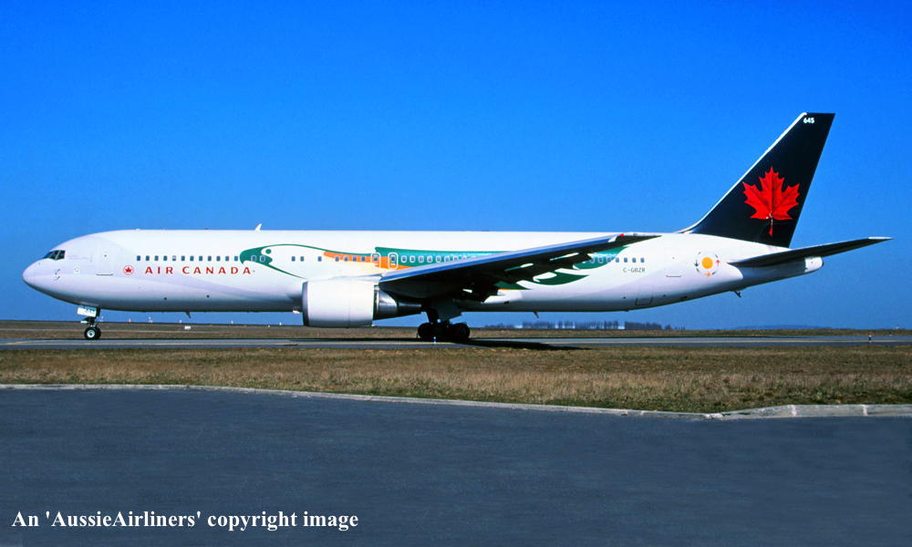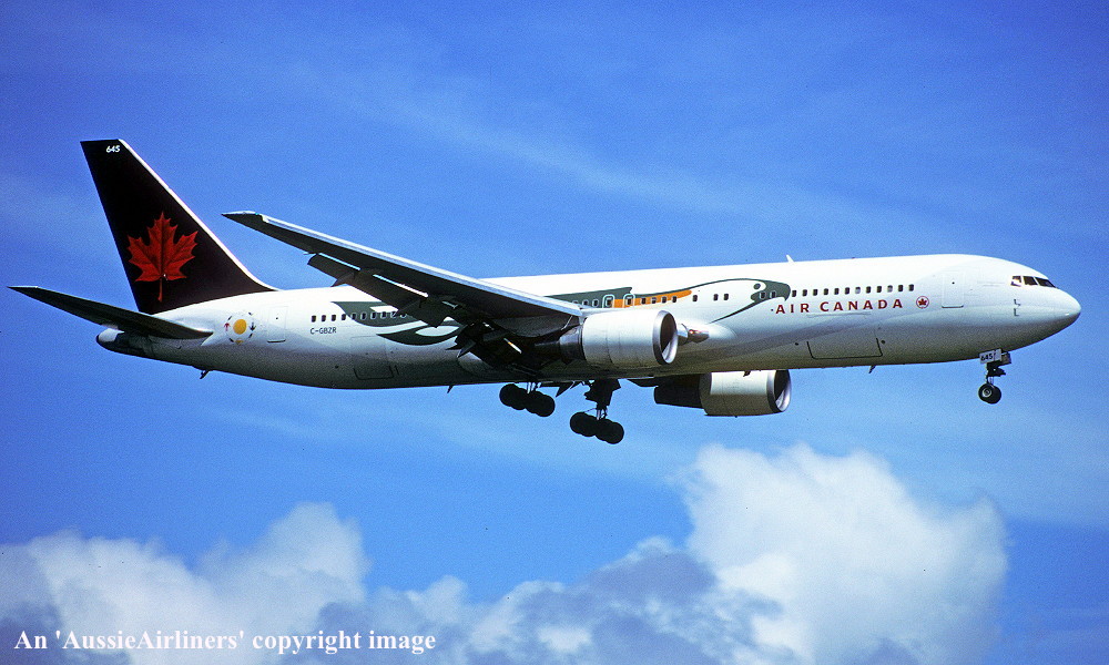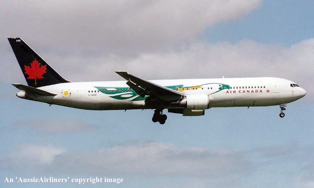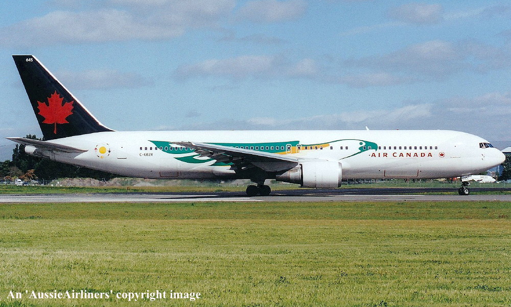 C-GBZR. Air Canada - in the 'Free Spirit' livery at Auckland Airport, November 2001. (J. Mounce Copyright Image 4655-154.) |