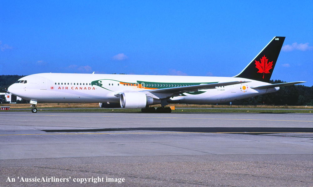 C-GBZR. Air Canada - in the 'Free Spirit' livery at Christchurch Airport, November 04, 2001. (Z. Rae Copyright Image 4655-159.) |