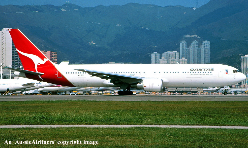 VH-OGI. Qantas The Australian Airline - 'City of Port Agusta' in the standard livery with additional '75 Years' logo at Hong Kong Kai Tak Airport, November 1995. (R. N. Smith Collection Copyright Image 4650-392.) |