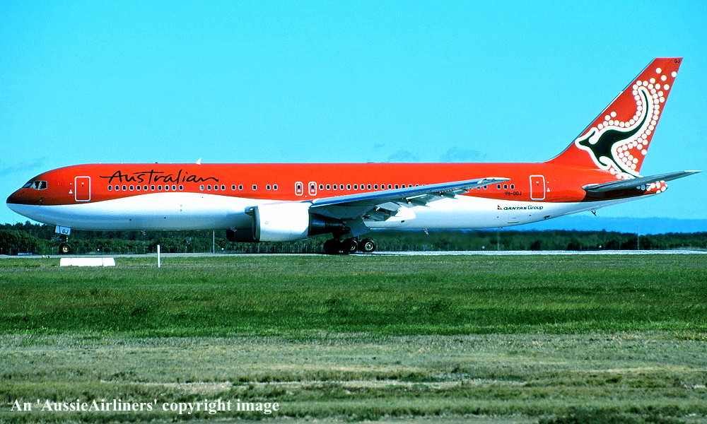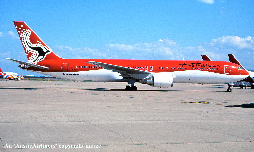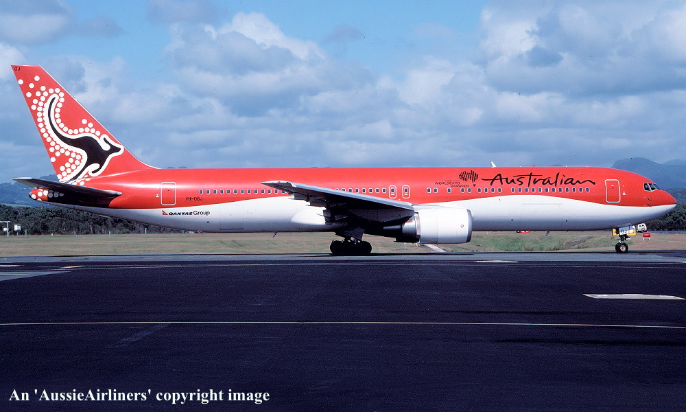 VH-OGJ. Australian - in the standard livery at Brisbane Airport, September 2002. (R. N. Smith Collection Copyright Image 4650-413.) |