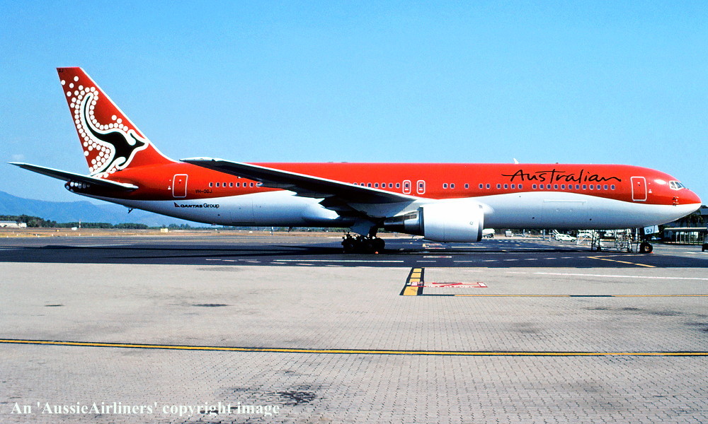VH-OGJ. Australian - in the standard livery at Brisbane Airport, September 2002. (R. N. Smith Collection Copyright Image 4650-414.) |