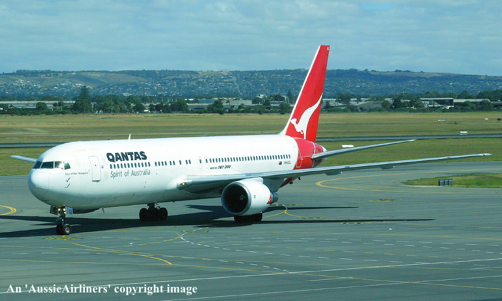VH-OGJ. Qantas Spirit of Australia - 'City of Port Macquarie' in the standard livery at Adelaide West Beach Airport, February 20, 2011. (N. K. Daw Copyright Image 4650-415.) |