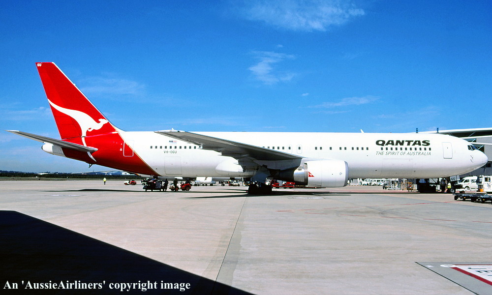 VH-OGU. Qantas Spirit Of Australia - 'Byron Bay' in the revised livery at Perth Airport, February 13, 2009. (R. N. Smith Collection Copyright Image 4650-792.) |