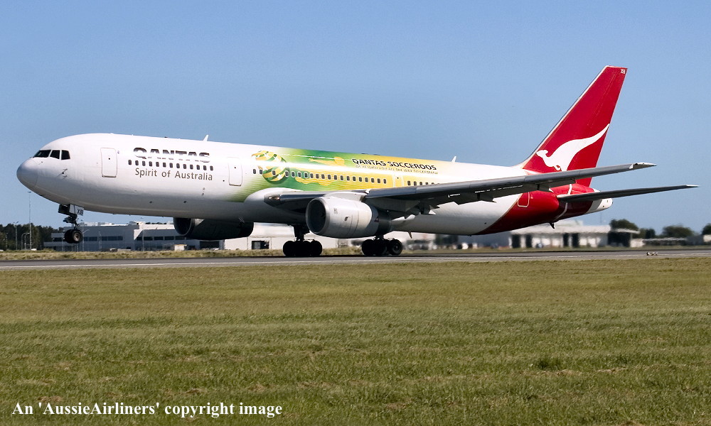 VH-ZXB. Qantas Spirit of Australia - in the revised livery with additional 'Qantas Socceroos' titles at Sydney Kingsford Smith Airport, June 06, 2006. (R. N. Smith Copyright Image 4650-840.) |