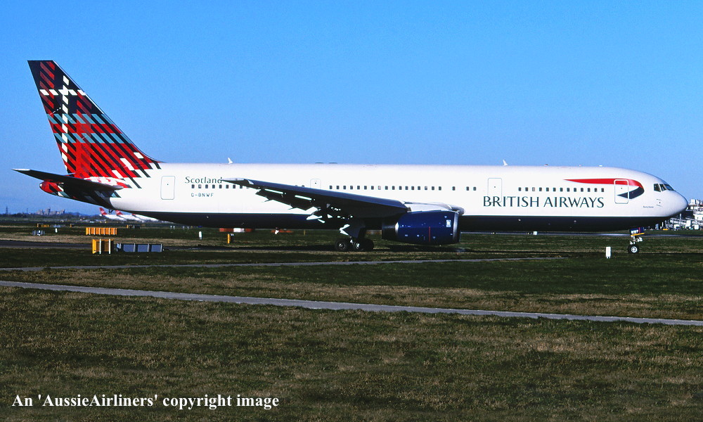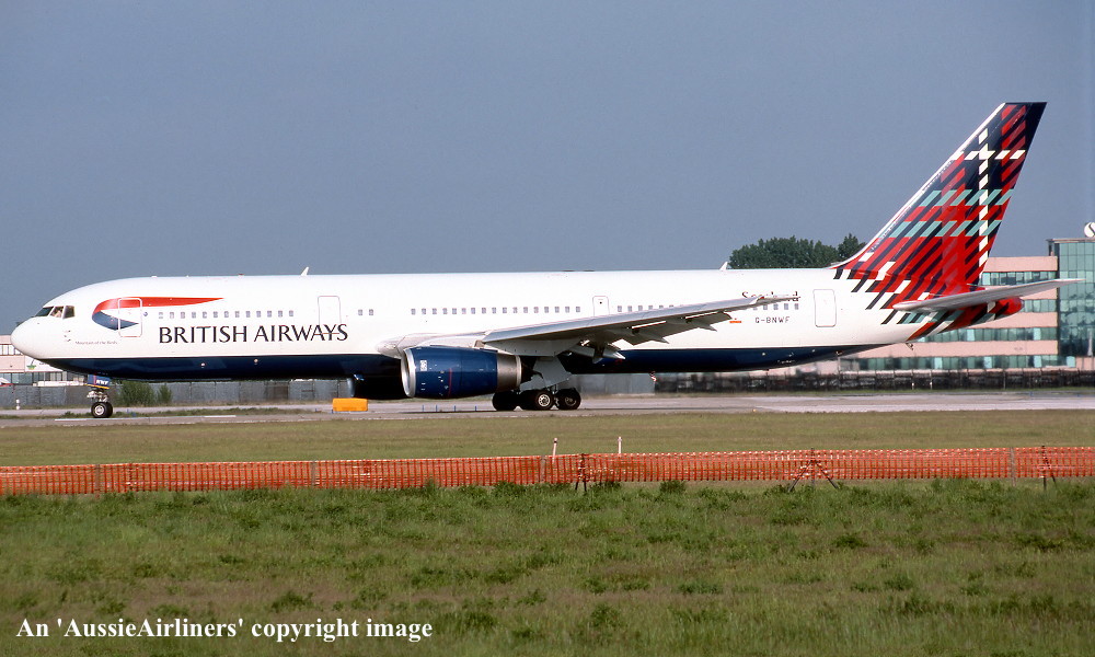 G-BNWF. British Airways - 'City of Milan' in the 'Benyhome' livery at an unknown airport, February 1999. (R. N. Smith Collection Copyright Image 4650-701.) |