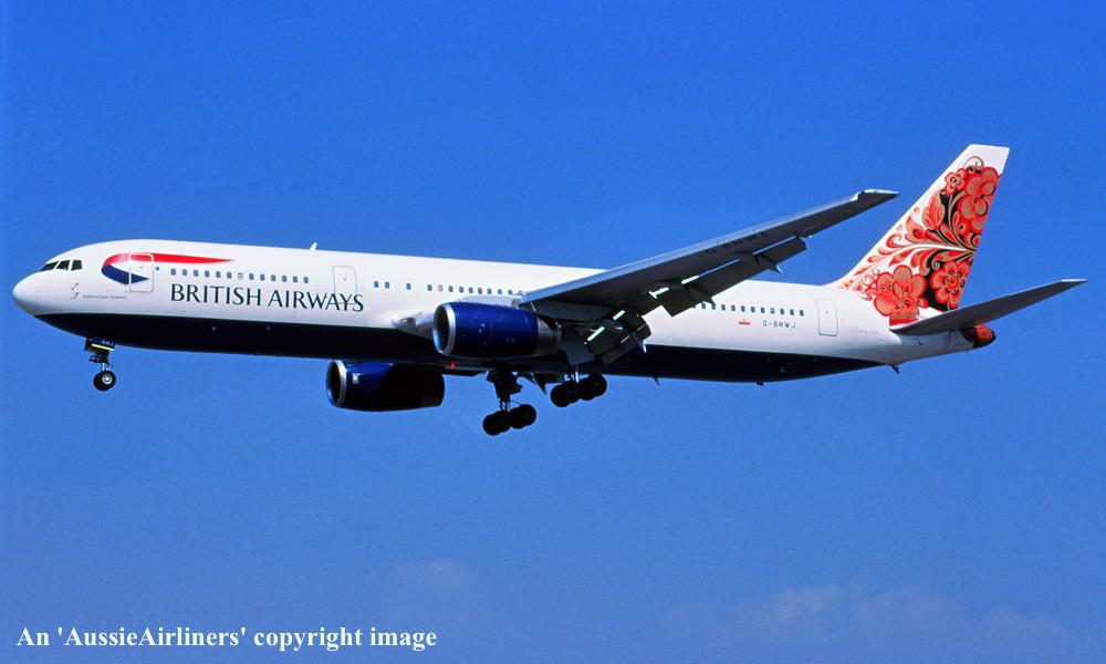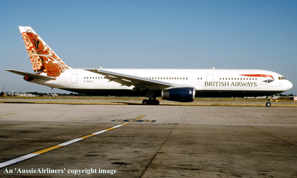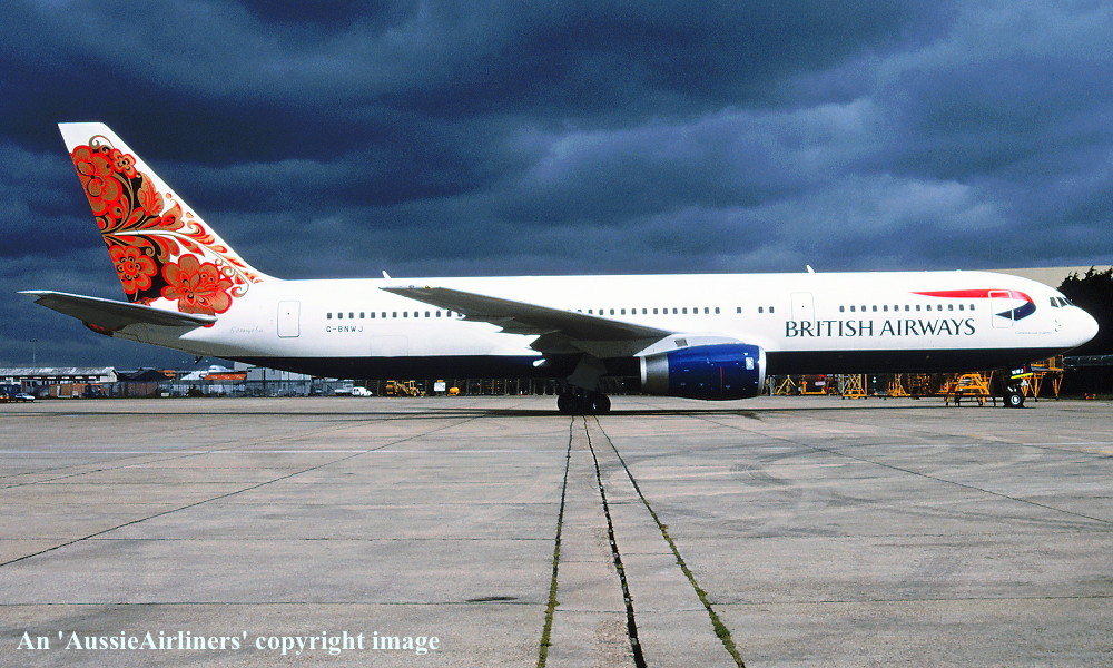 G-BNWJ. British Airways - 'City of Athens' in the 'Golden Khoknloma' livery at London Heathrow Airport, July 1999. (R. N. Smith Collection Copyright Image 4650-847.) |