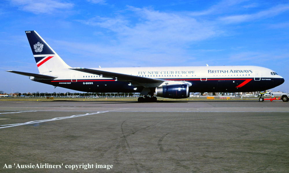 G-BNWK. British Airways - 'City of Amsterdam' in the original livery with additional 'Fly New Club Europe' titles at an unknown airport, March 1996. (R. N. Smith Collection Copyright Image 4650-229.) |
