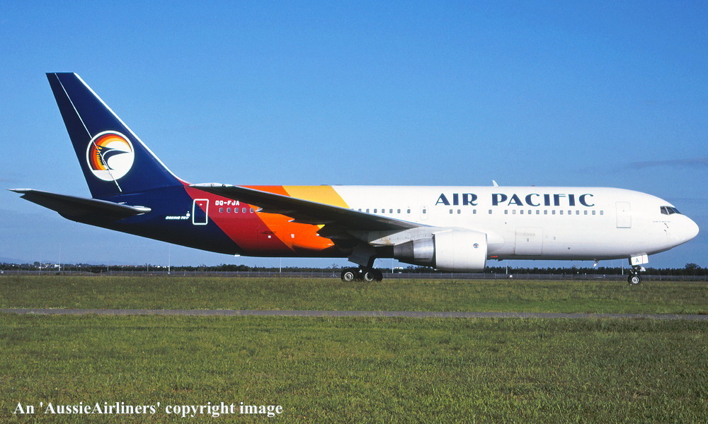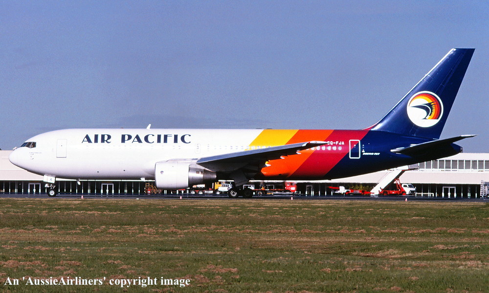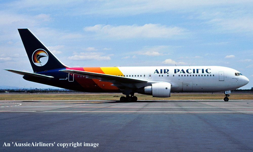 DQ-FJA. Air Pacific - 'Island of Vanua Levu' in the original livery at Brisbane Airport, December 1992. (R. N. Smith Collection Copyright Image 4655-033.) |