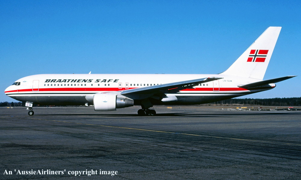 This aircraft was ordered new by Braathens ASA - ? First flown from Everett (Paine Field) as 'N6018N' - September 12, 1984 Powered by Pratt & Whitney JT9D-7R4D engines Entered onto the Norwegian Aircraft Register as LN-SUW - September 28, 1984 Registered to Braathens SAFE, Fornebu, Norway Accepted by Braathens at Everett (Paine Field) - September 29, 1984 Departed Everett (Paine Field) on the delivery flight to Norway - September 1984 Operated its final revenue service - ? Returned to Boeing Holding Company - September 02, 1986 Cancelled from the Norwegian Aircraft Register - September 02, 1986 Entered onto the United States Aircraft Register as N768BE - September 02, 1986 Registered to : It was observed at Everett (Boeing Field) in the 'Varig' livery - September 1986 Cancelled from the United States Aircraft Register - September 1986 Entered onto the Brazilian Aircraft Registeras PP-VNM - September 17, 1986 Leased to Varig Brazil as the registered operator It arrived at Rio de Janiero on delivery to Varig - September 19, 1986 Withdrawn from service and returned to the lessor at the end of the lease - August 11, 1987 Cancelled from the Brazilian Aircraft Register - August 12, 1987 Entered onto the United States Aircraft Register as N768BE - August 12, 1987 Registered to The Boeing Company, Everett, Washington The aircraft was converted to a 'Boeing 767-205ER' at Everett Ownership transferred to Polaris Leasing, U.S.A. - October 27, 1987 The aircraft was leased to Air New Zealand - October 27, 1987 Cancelled from the United States Aircraft Register - October 27, 1987 Entered onto the New Zealand Aircraft Register as ZK-NBD - October 28, 1987 Registered to Air New Zealand Limited, Auckland, New Zealand Departed Everett on the delivery flight to New Zealand in the basic 'Varig' livery - October 28, 1987 It arrived at Auckland on completion of the delivery flight - October 30, 1987 The aircraft was named 'Aparima' (in company of five) It was withdrawn from service at Auckland - June ?, 1990 It was repainted into the 'Air Pacific' livery at Auckland Cancelled from the New Zealand Aircraft Register - July 04, 1990 Entered onto the Fijian Aircraft Register as DQ-FJA - July 05, 1990 Registered to Air Pacific, Nadi Fiji Accepted by Air Pacific at Auckland - July 05, 1990 It was returned to International Lease Finance Corporation (ILFC) at Auckland - September 28, 1994 ILFC were the new owner of the aircraft Cancelled from the Fijian Aircraft Register - October ?, 1994 Entered onto the United States Aircraft Register as N651TW - October 31, 1994 Registered to First Security Bank of Utah Leased to Trans World Airlines as the registered operator Departed Auckland on the ferry flight to the United States - November 03, 1994 It arrived at Santa Barbara California on completion of the ferry flight - November 03, 1994 The aircraft was prepared for its lease to TWA at Santa Barbara Handed over to Trans World Airlines at Kansas City - December 15, 1994 Operated its first TWA revenue service - December 18, 1994 It was withdrawn from service by TWA and returned to ILFC - November 08, 2000 The aircraft was converted to a 'Packet Freighter' by ? Reregistered as N713AX - December 29, 2000 Registered to Airborne Express Delivered to Airborne Express (ABX Air) - December 29, 2000 The aircraft was repainted into the 'DHL Express' livery - mid 2006 Leased to DHL Network Operations (USA) Inc as the registered operator - June 29, 2010 Reregistered as N655GT - July 13, 2011 Ferried to Tel Aviv for conversion to freight configuration by Israeli Aircraft Industries - May 04, 2012 Test flown Tel Aviv - Tel Aviv in freighter configuration - October 04, 2012 The aircraft was now designated a 'Boeing 767-205ER(BDSF)' Sold to Wels Fargo Bank North West, Utah - November 05, 2012 Leased to Atlas Air as the registered operator It was withdrawn from Atlas Air service and stored at Roswell, New Mexico - May 24, 2021 Intended lease to ABX Air - August 2022 Current status - ? |