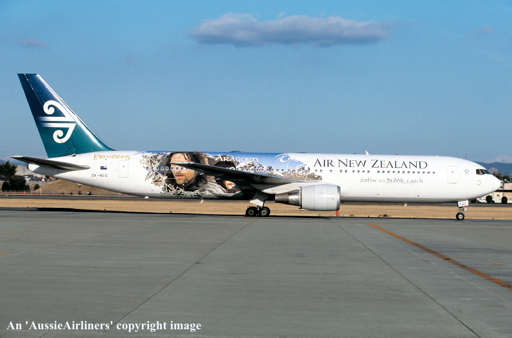 ZK-NCG. Air New Zealand - in the 'Lord of the Rings' livery at Osaka Airport, February 2004. (R. N. Smith Collection Copyright Image 4655-017.) |