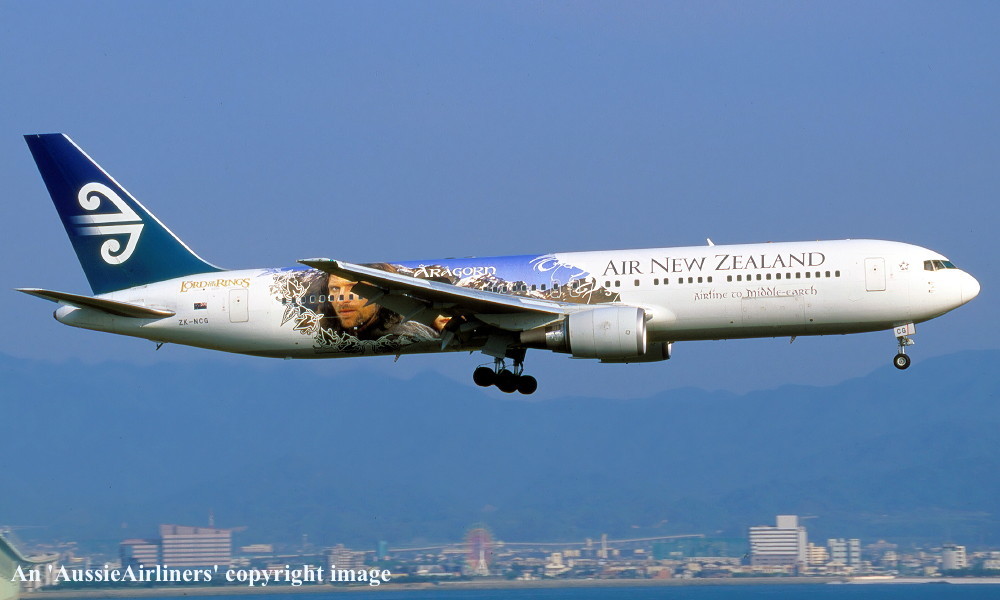 ZK-NCG. Air New Zealand - in the 'Lord of the Rings' livery at an unknown airport, February 2004. (R. N. Smith Collection Copyright Image 4655-010.) |