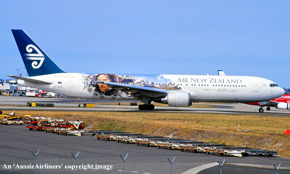 ZK-NCG. Air New Zealand - in the 'Lord of the Rings' livery at Sydney Kingsford Smith Airport, January 2004. (R. N. Smith Collection Copyright Image 4655-119.) |