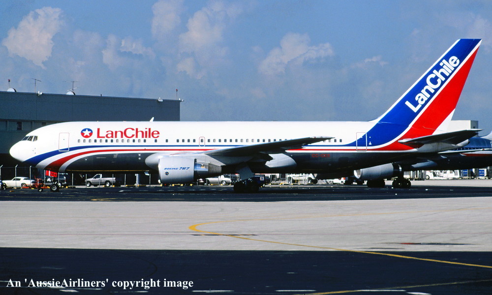 CC-CEX. LanChile - in the standard livery at an unknown airport, October 1990. (R. N. Smith Collection Copyright Image 4655-048.) |