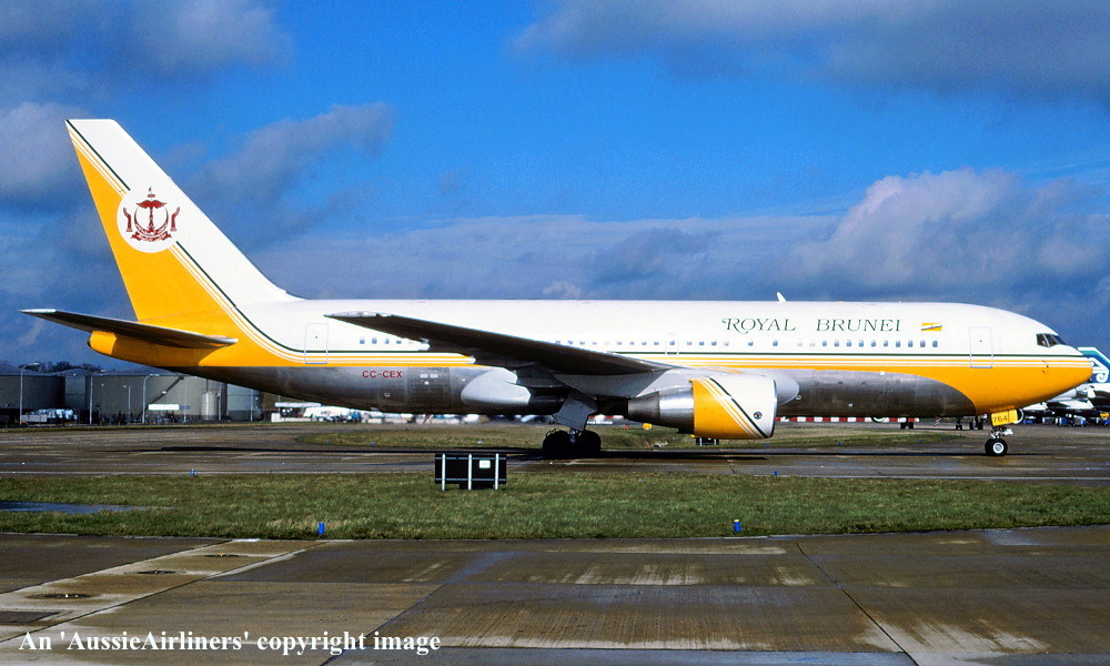 CC-CEX. Royal Brunei - in the standard livery at an unknown airport, March 1991. (R. N. Smith Collection Copyright Image 4655-049.) |