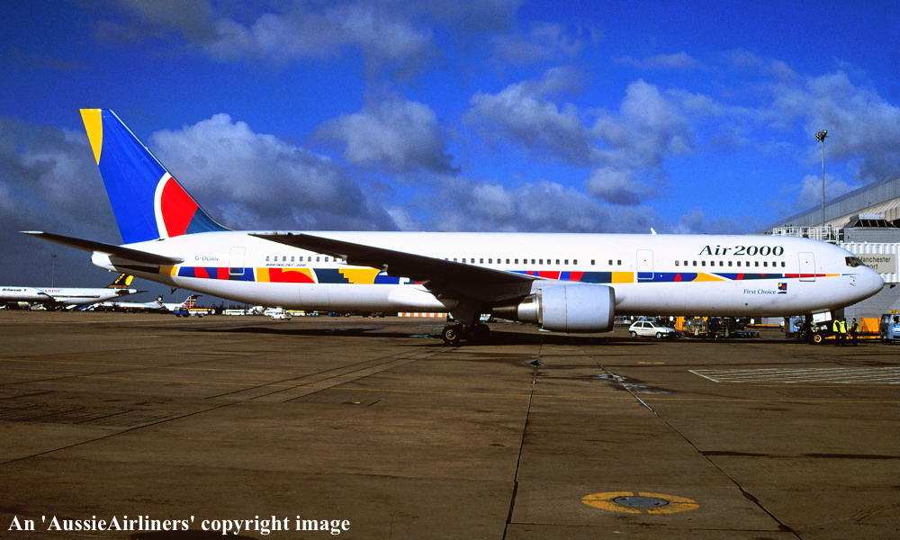 G-OOAN. Air 2000 - in the standard livery at Manchester Airport, February 1999.