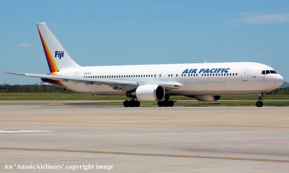 DQ-FJC. Air Pacific - 'Island of Taveuni' in the new livery at Brisbane Airport, December 14, 2008. (R. N. Smith Collection Copyright Image 4655-025.) |