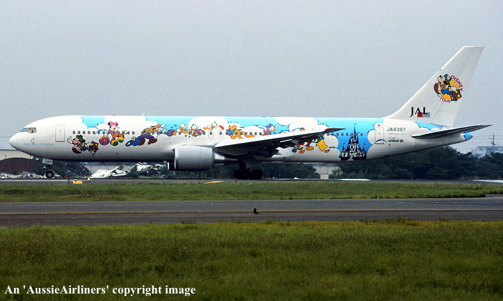 JA-8397. Japan Airlines - in the 'Disney On Tour' livery at Nagoya Airport, September 22, 1994.
