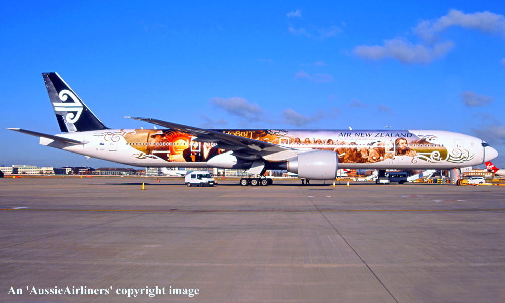 ZK-OKP. Air New Zealand - in the 'Hobbit' livery at London Heathrow Airport, date unknown. (R. N. Smith Collection Copyright Image 4670-210.) |