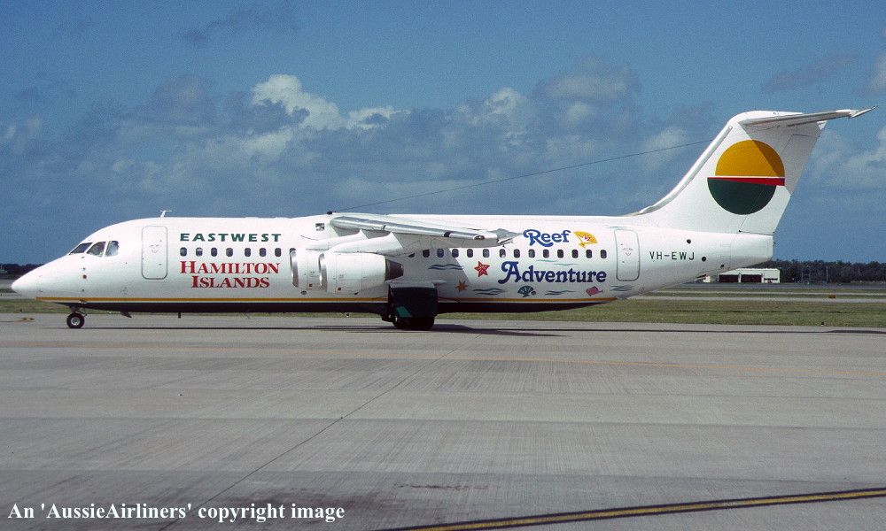 VH-EWJ. EastWest - in the standard livery with additional 'Hamilton Islands Reef Adventure' titles at Brisbane Airport, April 1993. (R. N. Smith Collection Copyright Image 0414-051.) |