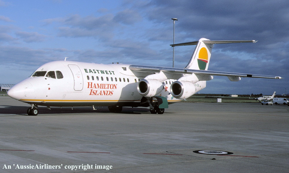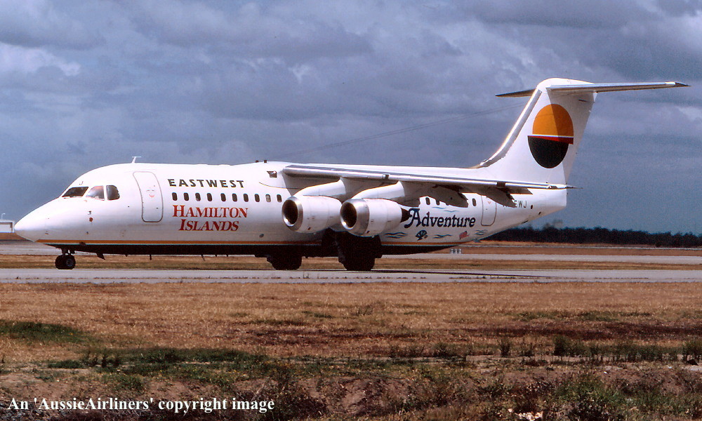 VH-EWJ. EastWest - in the standard livery with additional 'Hamilton Islands Reef Adventure' titles at Brisbane Airport, April 1992. (R. N. Smith Collection Copyright Image 0414-052.) |