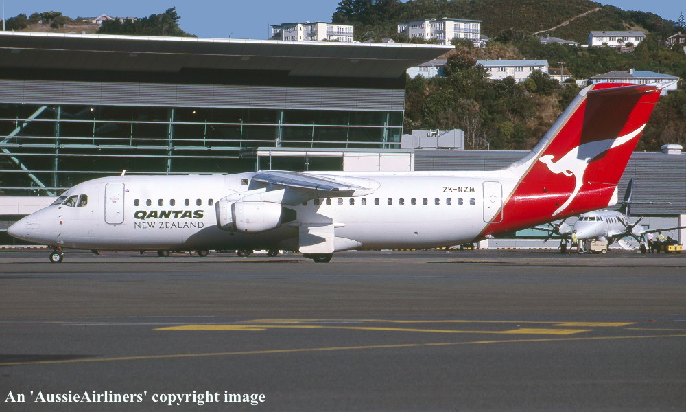 ZK-NZM. Qantas New Zealand - in the standard livery at Wellington Airport, January 2001. (M. Richardson Copyright Image 0414-185.) |