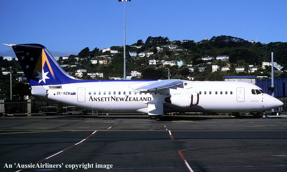 ZK-NZM. Ansett New Zealand - 'Queenstown' in the 'Starmark' livery at Wellington Airport, January 1997. (M. Richardson Copyright Image 0414-184.) |